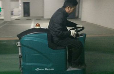 類似這種大型的漆面停車場,更合適的清潔方式是選用較大型的洗地車進行地面清潔。如綠美保H660B洗地車,清洗效率4500㎡/h,一人一車,15000㎡的停車場,4小時不到就能完成清潔,不管是泥沙、污水、灰塵,洗地車都能全部吸走無殘留,時刻保持地面的光亮如新。