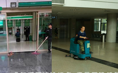 洗地機(jī)作為新型的清潔設(shè)備,自動(dòng)噴水、刷洗地面,污水回收,重點(diǎn)就是這個(gè)污水回收作用,是以前所有的清潔工具都不具備的。用洗地機(jī)洗過(guò)之后的地面,地面不僅很干凈,而且地面是干的,用紙巾擦一下都很干凈。所以綠保覺(jué)得異常心酸,第一感覺(jué)就是如果這個(gè)銀行的地面是用洗地機(jī)來(lái)清洗的話,這種尷尬讓人心酸的局面就不會(huì)出現(xiàn)。